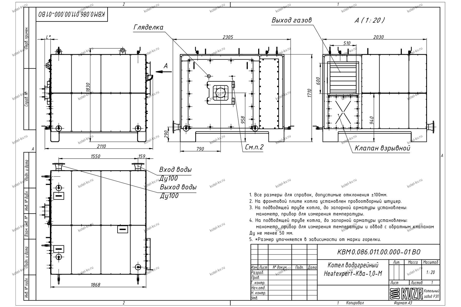 Стальной напольный водогрейный котел КВГМ 1.0 МВт на мазуте имеет газоплотные топочную камеру и конвективную часть. В заднем экране топочной камеры выполнено отверстие, в котором установлен взрывной клапан, предохраняющий конструкцию от разрушения при возникновении избыточного давления в топочной камере.